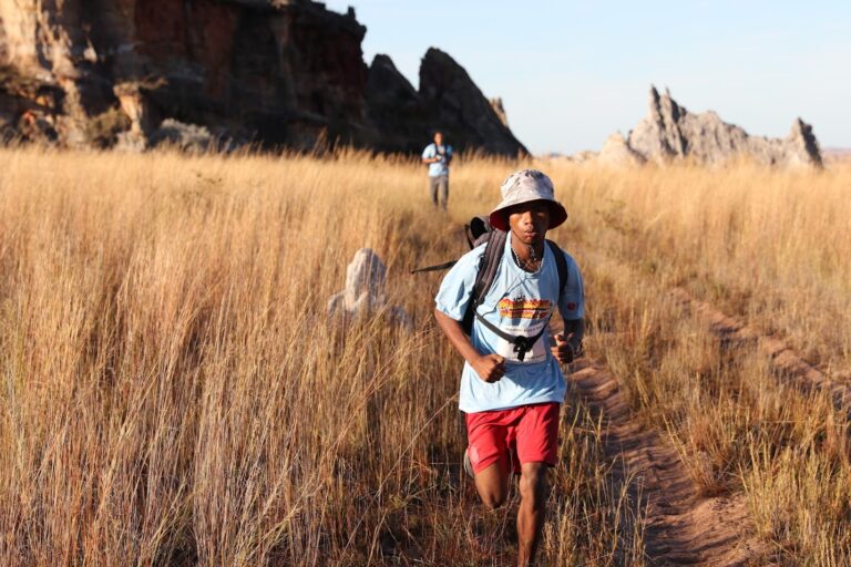 Course: The marathon course starts at Le Jardin du Roy. The course will cross over Highway 7 and enter Isalo National Park and run about a 14 mile loop back to Highway 7. The course follows some trails onto pasture land past through some small villages, across shallow streams and back to the finish at Jardin du Roy. A large loop within the park along grassy trails passes spectacular rock formations dating back millions of years. The courses have just a few rolling hills and good footing for 98% of the course. The half-marathon course is run almost entirely within Isalo National Park.